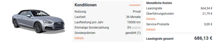 Da es hier keine Bereitstellungsgebühr oder Anzahlungen gibt, fällt die Rechnung sehr überschaubar aus: Die angegebenen 249€ monatlich sind auch tatsächlich schon die gesamten Kosten, die euch über die 3 Jahre hinweg als Leasingrate erwarten. Das ist ein Top-Preis, der mit Blick auf die Konkurrenz gleich noch besser erscheint: Bei Autohaus24.de zahlt ihr für ein ähnliches Modell (150PS) etwa 686€ monatlich. Allerdings handelt es sich dort dann auch um einen Neuwagen. Einen direkten 1:1-Vergleich für dieses Modell gibt es nicht, aber der Preis dürfte unschlagbar sein. Das Audi A5 Cabrio 2.0TDI quattro S-Line ist mit etwa 45.300€ als Neuwagen gelistet, Modelle mit ähnlichem Kilometerstand sind ab rund 26.000€ zu haben. Der rechnerische Leasingfaktor liegt damit bei 0,96.