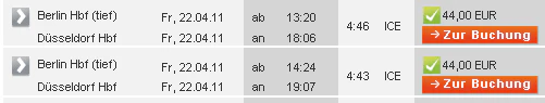 Update am 04.04.11: Ich habe mir gerade nochmal die Verfügbarkeit angeschaut und festgestellt, dass es aktuell noch sehr gut ist. Selbst zu Stoßzeiten bekommt man ohne Probleme die 44€-Tickets. Wenn man zu zweit unterwegs ist, muss der Preis wirklich keinen Vergleich scheuen (zur Buchungsseite).