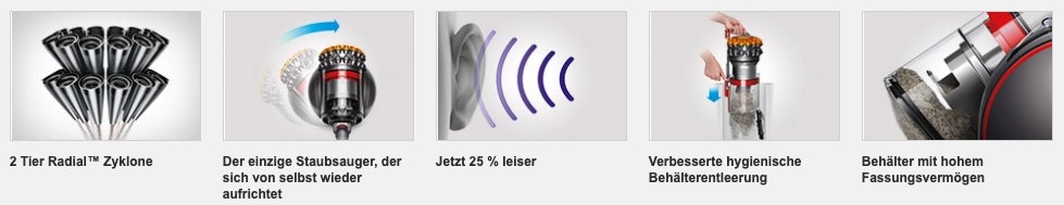 Der Staubsauger hat zwei Zyklonreihen, welche gleichzeitig arbeiten um den Luftstrom zu erhöhen. Insgesamt gibt es genügend Power mit einer Saugleistung von 184 W. Es gibt einen zentralen Lenkmechanismus und somit ist der Staubsauger einfach zu kontrollieren und zu lenken. Generell ist der Dyson sehr leicht und mobil.