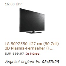 [update]Für Leute, die noch einen großen Plasma TV suchen, gibt es heute ab 16 Uhr Chancen auf einen genialen Preis für den 50PZ550 bei den Amazon Blitzangeboten: