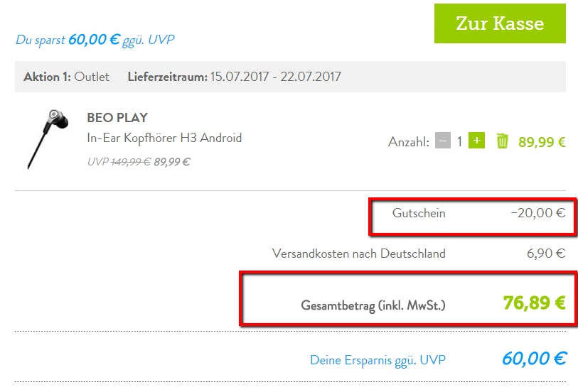 Gute Musik allein reicht nicht, man braucht schon die passenden Boxen oder eben Kopfhörer, um das maximale Klangerlebnis ausschöpfen zu können. Mit den Bang & Olufsen In-Ear-Kopfhöreren sollte es zumindest nicht mehr an der Klangqualität scheitern. Um die Kopfhörer aus Dänemark zu dem Preis zu bekommen, müsst ihr einfach im Warenkorb den oben genannten Gutschein in das dafür vorgesehene Feld eintragen. Wie das Ganze dann aussieht, seht ihr hier: