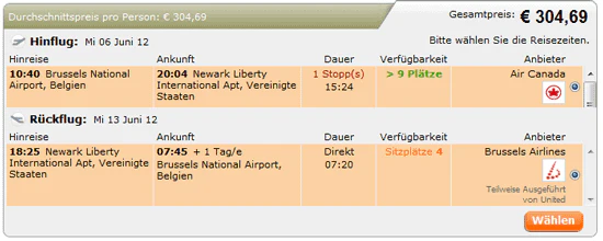 - Brüssel – New York für 304,69 (BRU-EWR) – Hinflug mit Air Canada, Rückflug mit Brussels Airlines (Flug Frankfurt-New York im Juni: ~500)