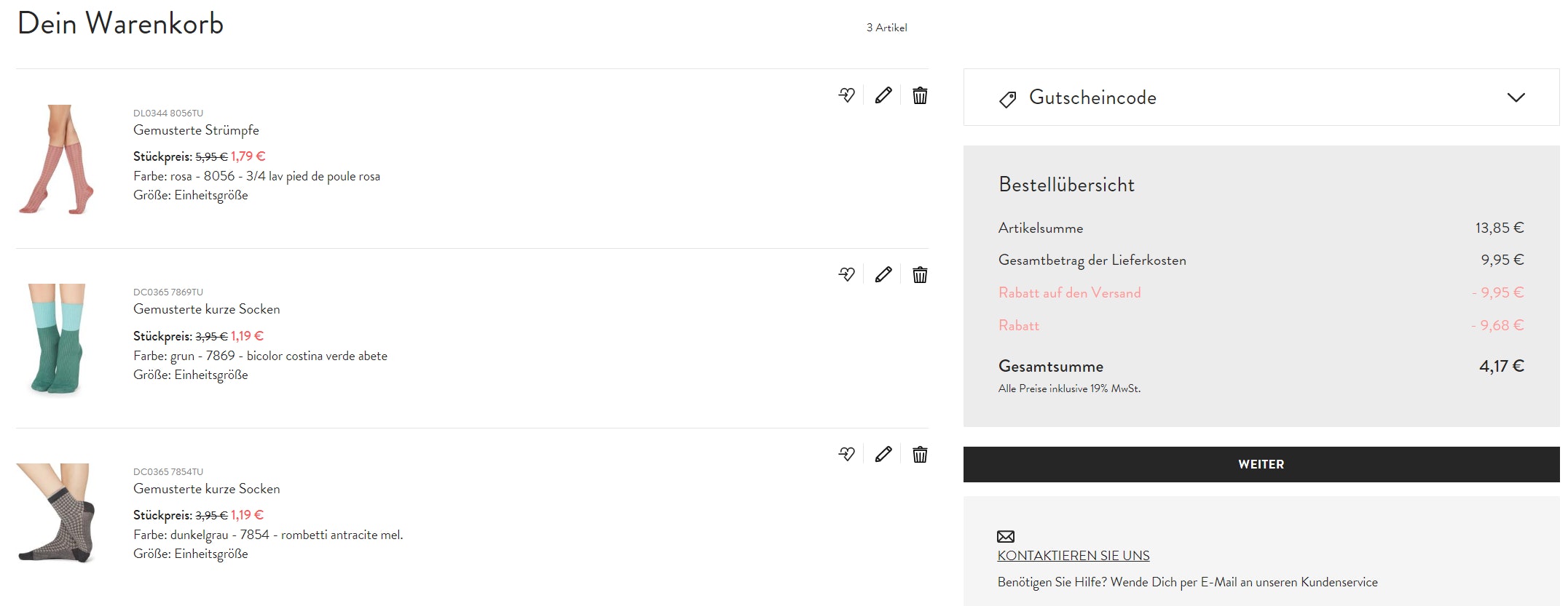 Calzedonia streicht bei dieser Aktion diverse, üblicherweise mit summierte Euros aus der Kalkulation, sodass das vorliegende Socken-Trio für gerade einmal insgesamt 4,17€ zu euch geflattert kommt.