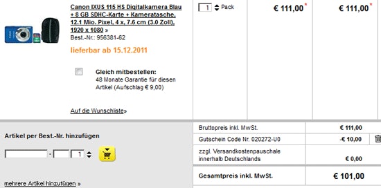 - Canon Ixus 115 HS für 101 inkl. Gratisversand und 8GB microSD-Karte mit Gutscheincode: 020272-U0 (Preisvergleich: 115 + ~7 = 122)
