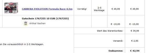 Nils hat mich auf ein gutes Angebot bei mytoys hingewiesen. Dort ist eine Carrera Bahn im Angebot, die zwar ein älteres Modell ist, sich aber nur geringfügig von den aktuellen Modellen unterschiedet. Dafür ist der Preis gegenüber der UVP (nicht Marktpreis!) um 50% reduziert. Kombiniert man das noch mit einem 10 mytoys Gutschein, kommt ein super Preis dabei raus:
