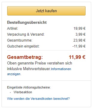 Auf den Schnäppchenpreis kommt ihr mit dem Gutscheincode RSWGYK2S. Den gebt ihr einfach an der Kasse ein und schwups, zahlt ihr nur noch 11,99€. Falls ihr Amazon Prime-Kunde seid, spart ihr euch sogar noch die Versandkosten!