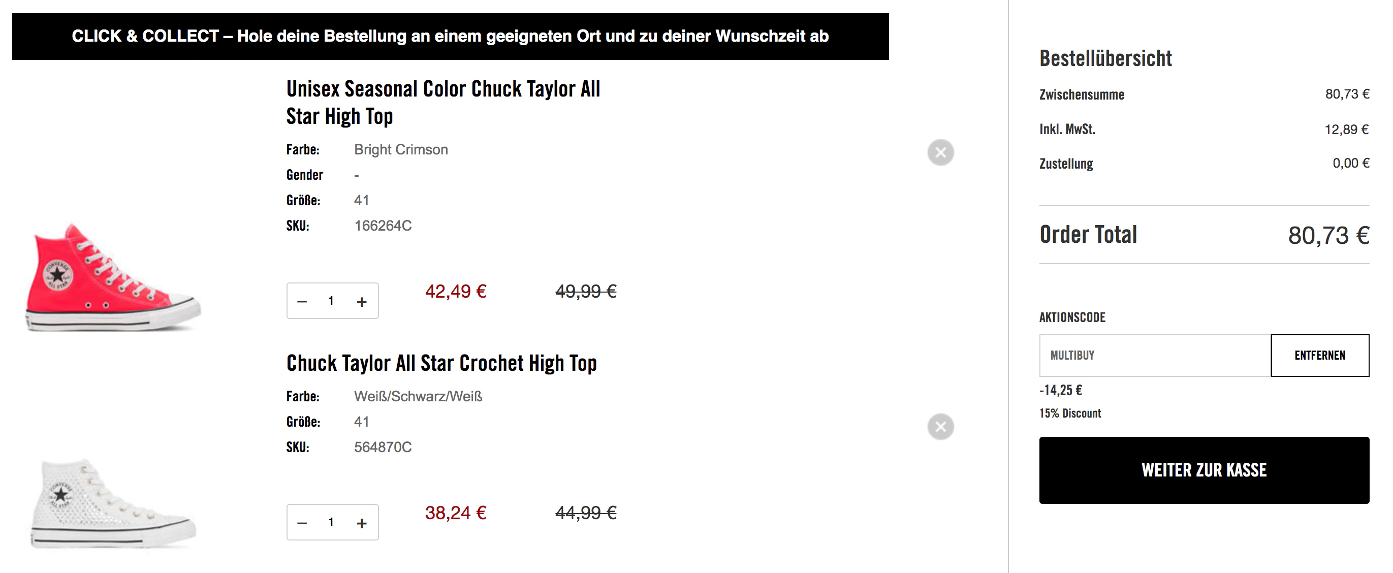 Wenn ihr euch durch den Sale-Bereich geshoppt und alle Artikel in den Warenkorb gepackt habt, dann macht euch auf den Weg zur Kasse. Ihr bekommt noch mal eine Übersicht über euren Warenkorb und habt dort die Möglichkeit, in das Feld „Aktionscode“ den Code MULTIBUY einzugeben. Der Rabatt wird nun vom Endbetrag abgezogen.