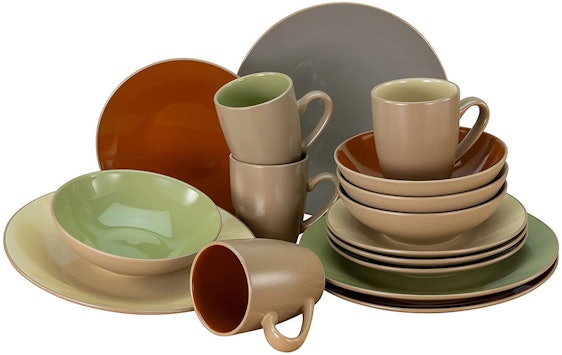 Produktname: Creatable Urban Jungle Geschirrset (22563) Produkttyp: Kombiservice • Ausstattung & Lieferumfang: • Set-Größe: 16 tlg. • geeignet: 4 Personen • bestehend aus: 4 x Kaffeebecher, 4 x Schüssel, 4 x Speiseteller, 4 x Dessertteller • Material & Eigenschaften: • Material: Steinzeug • Materialeigenschaften: mikrowellengeeignet, spülmaschinengeeignet • Form & Farbe: • Form: rund • Farben: grün, beige, rot • Stilrichtung: modern •
