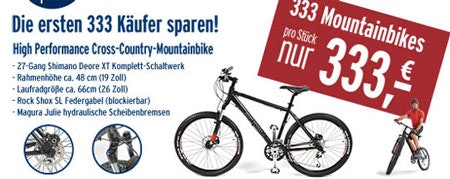 Tchibo gibt zwar an, dass Rad von 999 runtergesetzt ist, aber zu dem Preis wurde es wohl nie verkauft. Laut MTB Forum waren 500 der alte Preis. Dort schreiben die Experten, dass das sicher kein Topbike ist, aber als Einsteigerbike gar keine schlechte Wahl sei, und vor allem gehen sie dabei von 500 aus. Die Komponenten übersteigen 333 im Wert locker, das größte Problem ist das Gewicht von 14 Kilo.