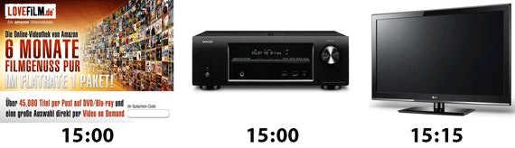 - 15:00 – 6 Monate Lovefilm Flatrate Paket 1 (für Neukunden) für 16,99 (regulär: 72) – auch wenn es das schon häufig gab, ist es genial (Schnäppchenfuchs-Artikel)
