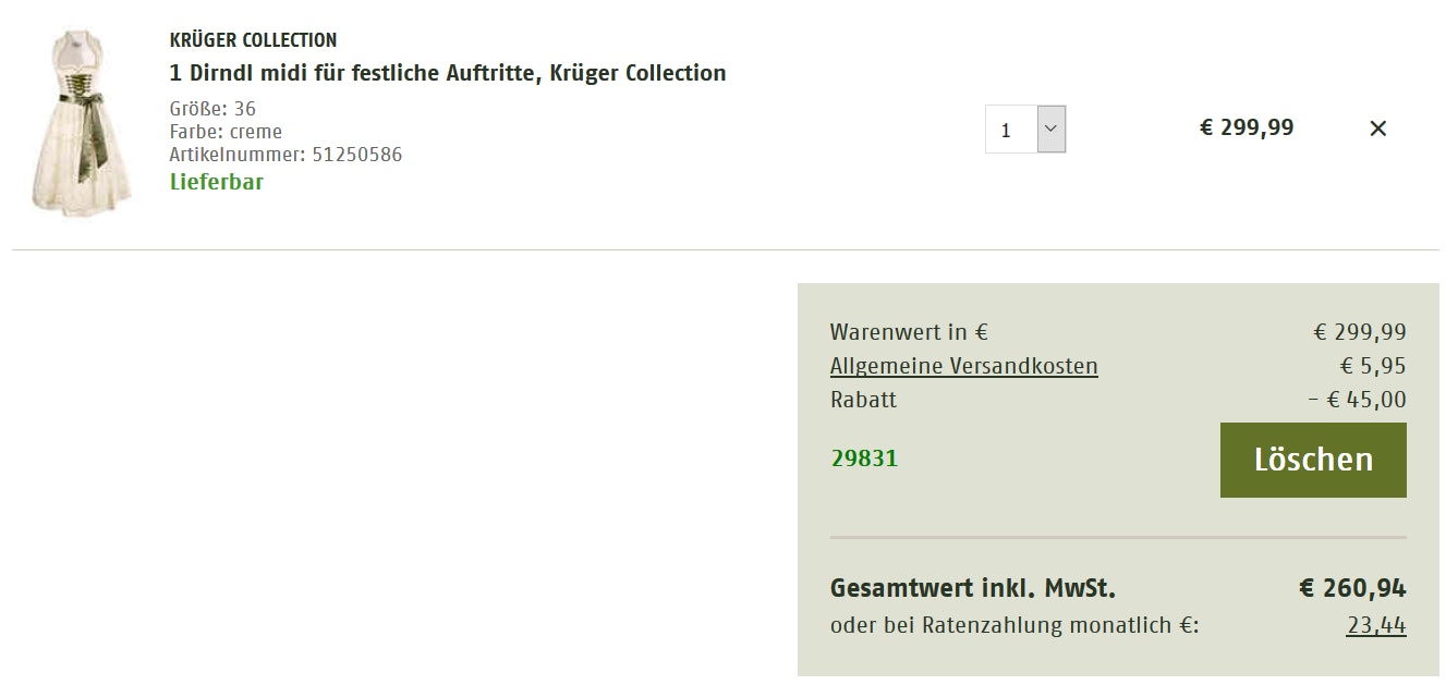 Hier könnt ihr noch einmal sehen, wie das Ganze in eurem Warenkorb aussieht. Der Rabatt wird erst im letzten Bestellschritt abgezogen, ihr braucht also ein wenig Geduld: