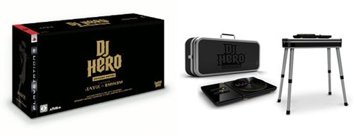 Der Vergleichspreis ist natürlich nicht ganz korrekt, denn das normale DJ Hero Turntable Bundle würde auch schon 25 kosten. Diese enthält ein passendes DJ-Pult, ein Turntable-Case, das passende Turntable-Tischchen (Bild) und eine Doppel-CD mit Tracks von Eminem und Jay-Z. Das Renegade-Turntable unterscheidet sich nur in der Farbe (komplett schwarz).