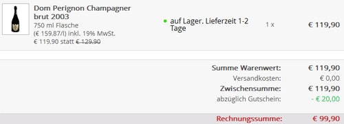 - Dom Pérignon Brut 0,75l für 99,90 inkl. Versand mit Gutscheincode: „DOM PERIGNON“ (Preisvergleich: 123)
