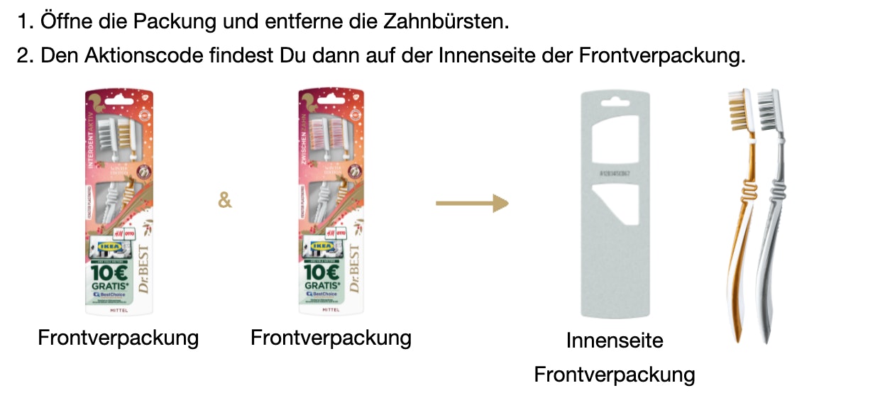 Um den BestChoice Gutschein von 10€ zu erhalten, müsst ihr innerhalb des Aktionszeitraums, der bis zum 01. September 2022 geht, zwei der limitierten Editionen der Dr. Best kaufen. Es handelt sich um die Winter-Edition, die es einmal als „Interdent Aktiv“ und einmal als „Zwischenzahn“ im Doppelpack gibt. In den Packungen der Zahnbürsten findet ihr jeweils einen Aktionscode. Habt ihr beide Aktionscodes zusammen, löst ihr diese auf der Dr. Best Homepage ein und erhaltet in kurzer Zeit euren Gutschein über 10€.