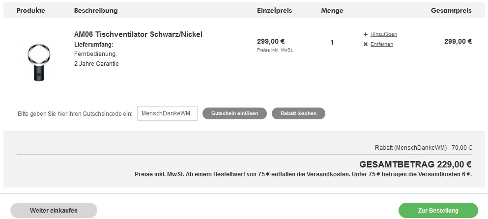Bei den Temepraturen da draußen, hilft eigentlich nur noch die Klima. Da die meisten von euch im Haushalt sicherlich nicht mit diesem Luxus ausgestattet sind, könnt ihr euch mit einem Ventilator Abhilfe verschaffen, der ganz und gar untypisch aussieht. Der Dyson AM06 Air Multiplier kommt nämlich ohne Rotorblätter daher, sondern einen stufenlos regulierbaren Luftstrom dank Gebläse. Mit dem 70€ Gutscheincode bekommt ihr das Gerät direkt bei Dyson deutlich günstiger als im Preisvergleich.