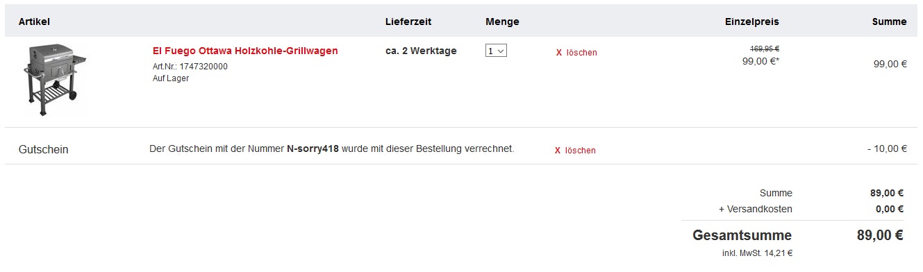 Hier gibt es noch einen Screenshot vom Warenkorb. So sollte das Ganze dann auch bei euch aussehen, nachdem ihr den Gutscheincode eingegeben habt: