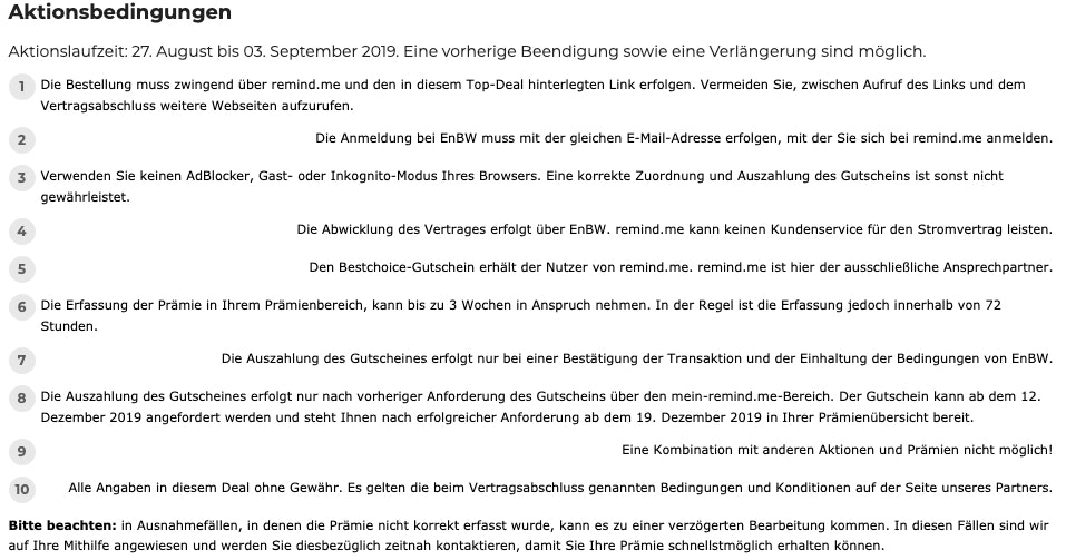 - Damit ihr die Prämie erhaltet, müsst ihr bis zum 3. September über Remind.me einen Strom-Tarif bei EnBW abschließen.