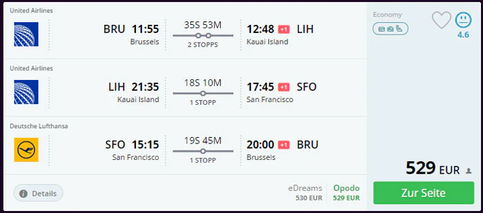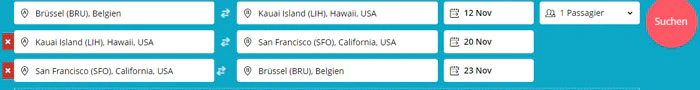 Beispiel: Brüssel – Kauai Island – San Francisco – Brüssel (12.11. – 20.11. – 23.11.)