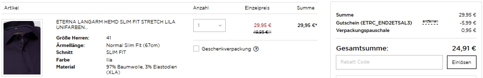 - Eterna Hemd Stretch Lila für 24,91€ inkl. Versand (Preisvergleich: 33€)