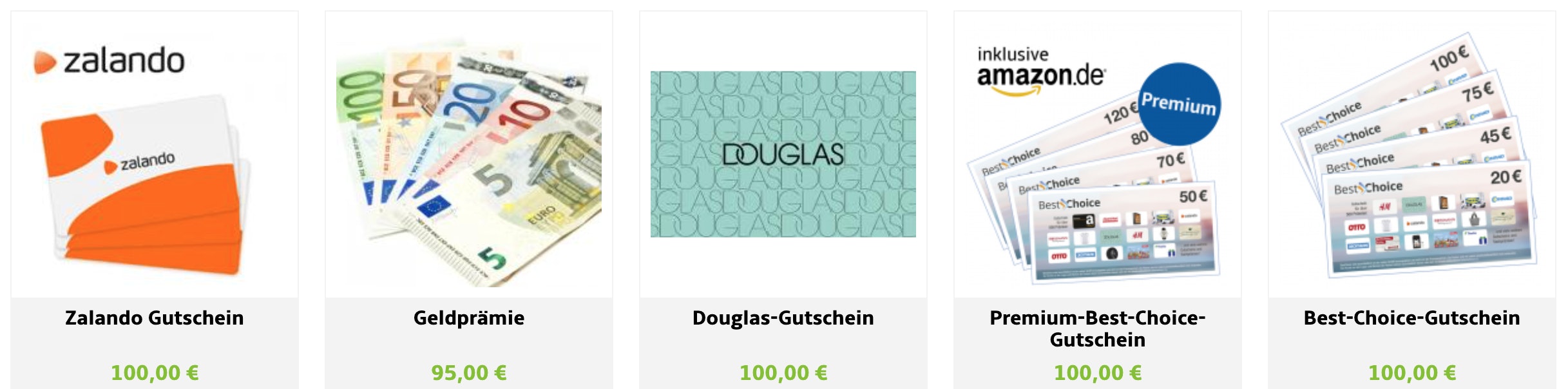 - Prämie: 100€ Zalando-, Douglas-, BestChoice-, Premium-BestChoice-Gutschein oder 95€ Geldprämie