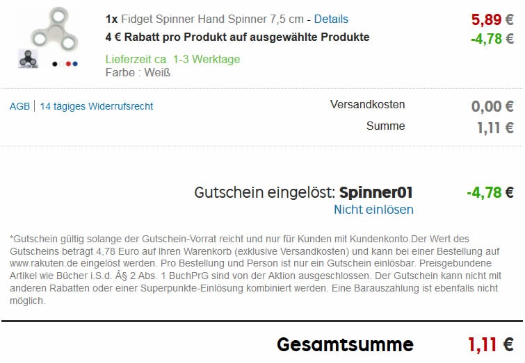 Wenn ihr solch einen „Fingerkreisel“ noch nie ausprobiert habt, oder ihr solch ein Gimmick gerne verschenken wollt, dann habt ihr hier die perfekte Möglichkeit dazu. Den Gutscheincode könnt ihr erst bei eingeloggtem Kundenkonto im letzten Bestellschritt eingeben. Und so sollte es dann aussehen: