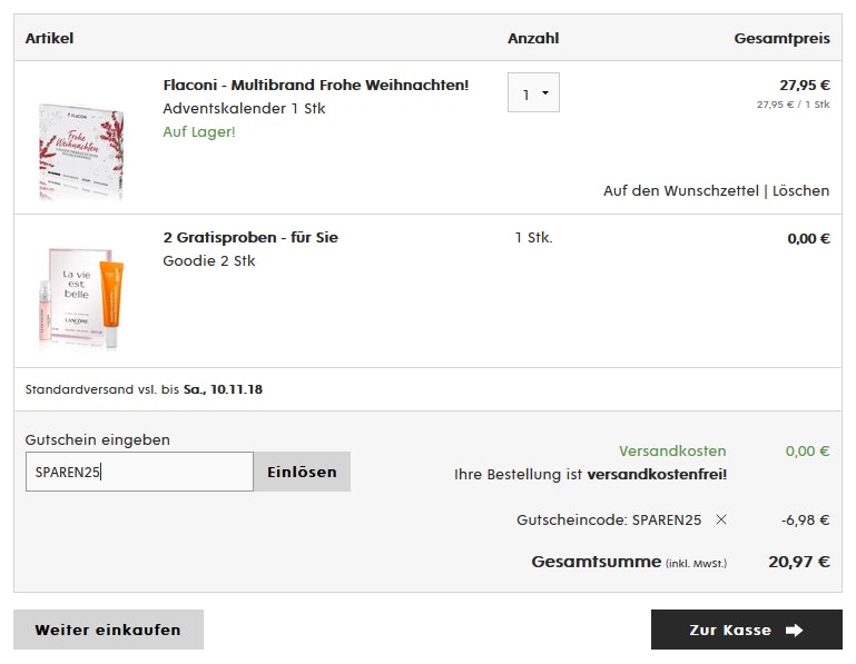 Auf den genannten Preis kommt ihr wie gesagt durch den Gutscheincode „SPAREN25“, der euch 25% Rabatt auf den Einkauf bei Flaconi ermöglicht. Diesen könnt ihr übrigens für alle nicht bereits reduzierten Produkte nutzen im Onlineshop, da finden sich also sicherlich noch weitere gute Schnäppchen!