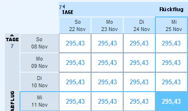Die Verfügbarkeit der Flüge ist – wie oben im Bild zu sehen – momentan prächtig. Noch hat man volle Freiheiten. Im Oktober und Dezember sind die Preise aber schlechter, mitunter doppelt so hoch.