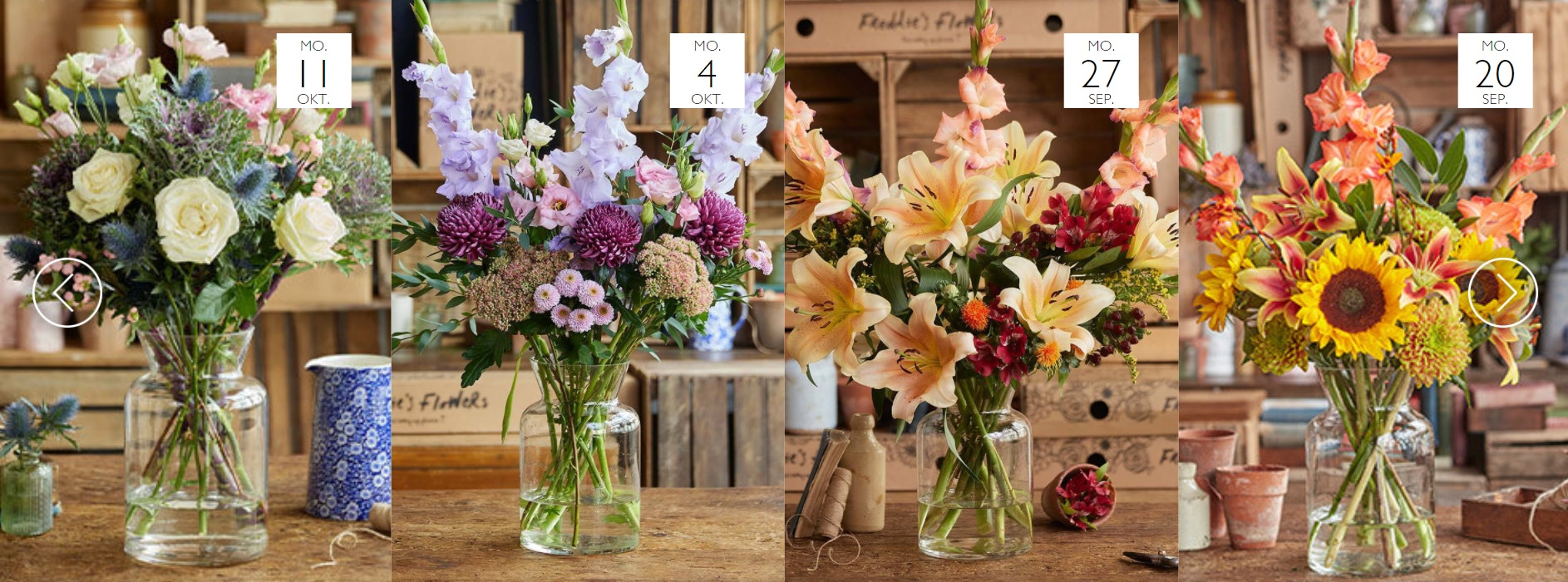 Freddie’s Flowers liefert euch deutschlandweit jede Woche (oder auch seltener, wenn ihr das möchtet) einen frischen Blumenstrauß nach Hause. Ihr dürft dann auch etwas kreativ werden und das Gesteck selbstständig arrangieren – eine Anleitung dafür bekommt ihr mitgeliefert. Außerdem werdet ihr mit Infos zu den enthaltenen Blumen versorgt, es gibt also auch immer eine kleine Portion Nerd-Wissen. Die passende Pflanzennahrung ist ebenfalls dabei, so bleibt der Strauß bis zur nächsten Lieferung frisch. Bei Trustpilot bekommt der UK-Export im Schnitt übrigens 4,7 von 5 Sternen. Und hier seht ihr noch einige Beispielarrangements der letzten Wochen: