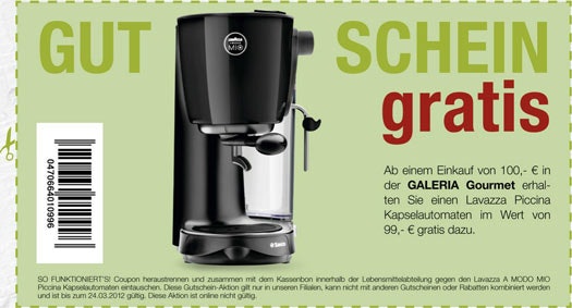 Da ist es wiedermal Schade das Galleria nur am Arsch der Welt zu finden ist. ;) Aber Theoretisch kannst kannste auch für 100 Euro Kapseln kaufen und die Maschiene dazu und läßt dir das ganze (dank Einkaufswert 100 Euro) das ganze kostenlos nach Hause liefern. ;)