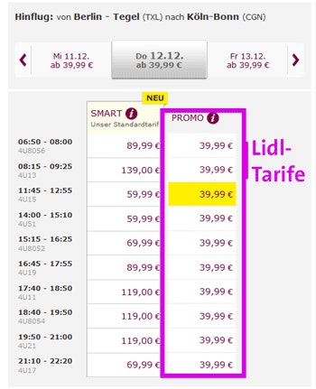 Der absolute Hammer ist aber, dass über Lidl noch viele Flüge für 39,99€ verfügbar sind, für die Normalsterbliche schon Tarife über 100€ pro Strecke zahlen müssen. Am besten wird das an diesem Screenshot sichtbar – die pink eingerahmte Spalte bekommen nämlich nur die Lidl-Kunden zu sehen: