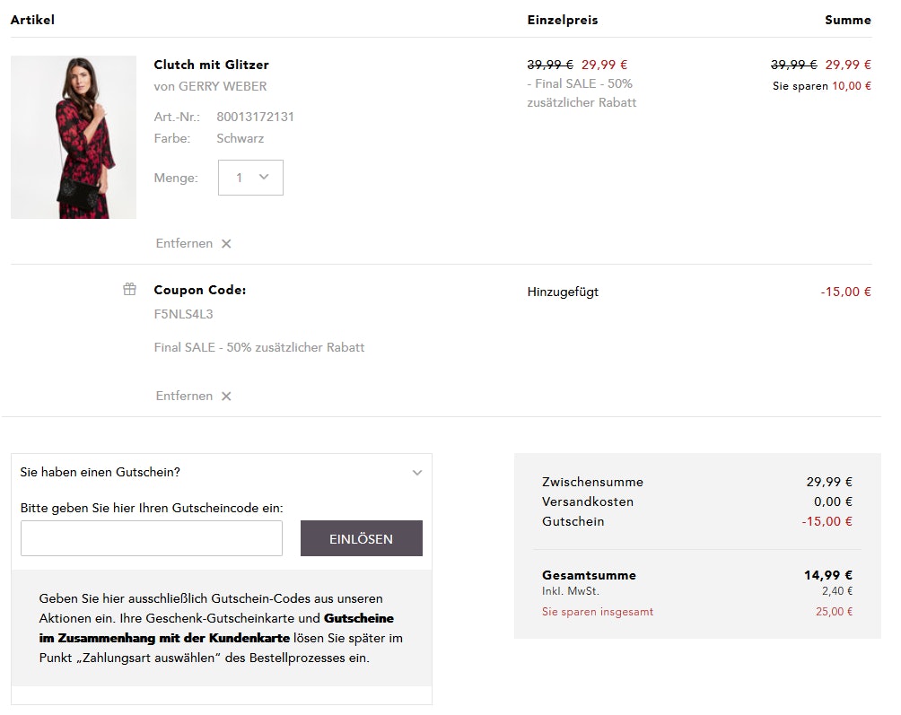Um den Rabatt zu erhalten, müsst ihr im Warenkorb den Gutscheincode F5NLS4L3 eingeben, schon purzelt der Preis. So könnte das Ganze dann bei euch aussehen: