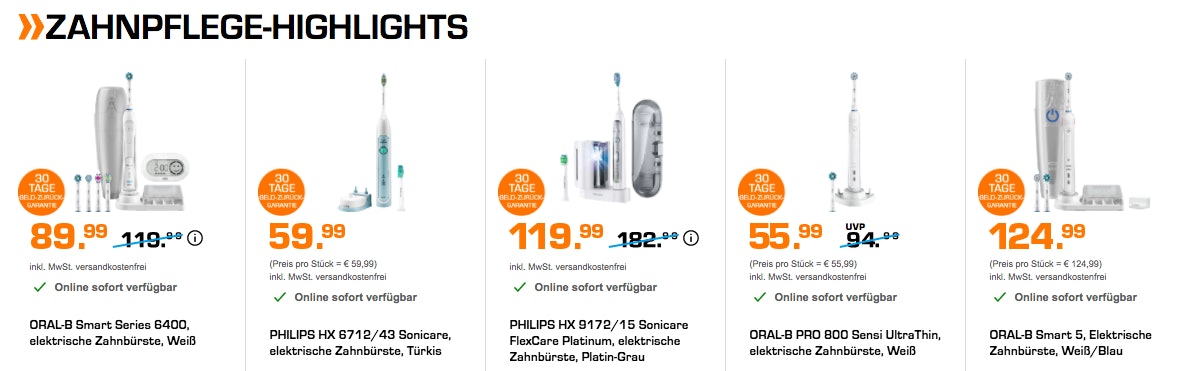 10 Produkte hat Saturn übersichtlich herausgesucht. Dabei sind Geräte von Oral-B, Panasonic und Philips. Doch nicht nur elektrische Zahnbürsten sind darunter, auch Ersatzbürsten und eine Munddusche gibt es. Die Versandkosten entfallen.