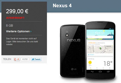 Wer seine Chance auch diesmal nicht nutzen konnte, wird sich dann ab 15. Dezember vor die Tore Media Markts stellen müssen (ab 19. Dezember bei Saturn), um sein Nexus 4 zu erstehen. Dann wird es wohl 50 teurer, was jedoch günstiger ist, als bei eBay.