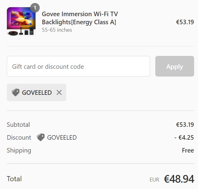 - Govee Immersion H61993D1 für 48,94€ inkl. Versand bei Govee.com (Preisvergleich: 76€)