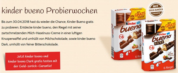 Genau vor einem Jahr gab es diese Aktion schon mal und nun dürfen wir wieder gratis schlemmen. Kauft euch Kinder bueno Classic und Kinder Bueno Dark und erhaltet euer Geld zurück. Beide Sorten dürfen einmal getestet werden. Wichtig: es müssen Aktionspackungen mit Aktionscode sein.