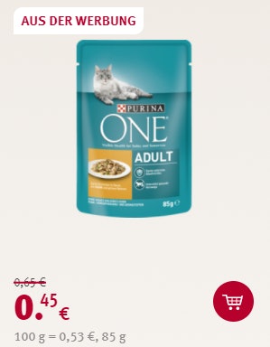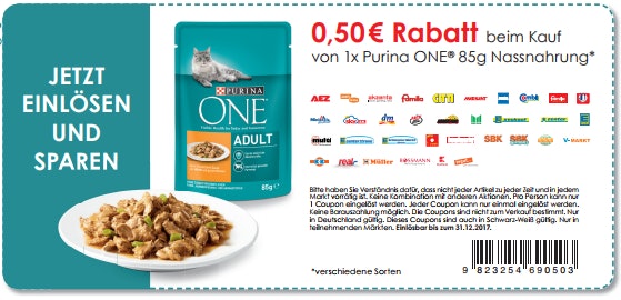 Übrigens: Einen Purina One Portionsbeutel erhaltet ihr diese Woche bei Rossmann gratis, wenn ihr diesen Gutschein an der Kasse vorzeigt. Der Gutschein hat einen Wert von 50 Cent und die Purina One Beutel sind noch bis Freitag auf 45 Cent reduziert.