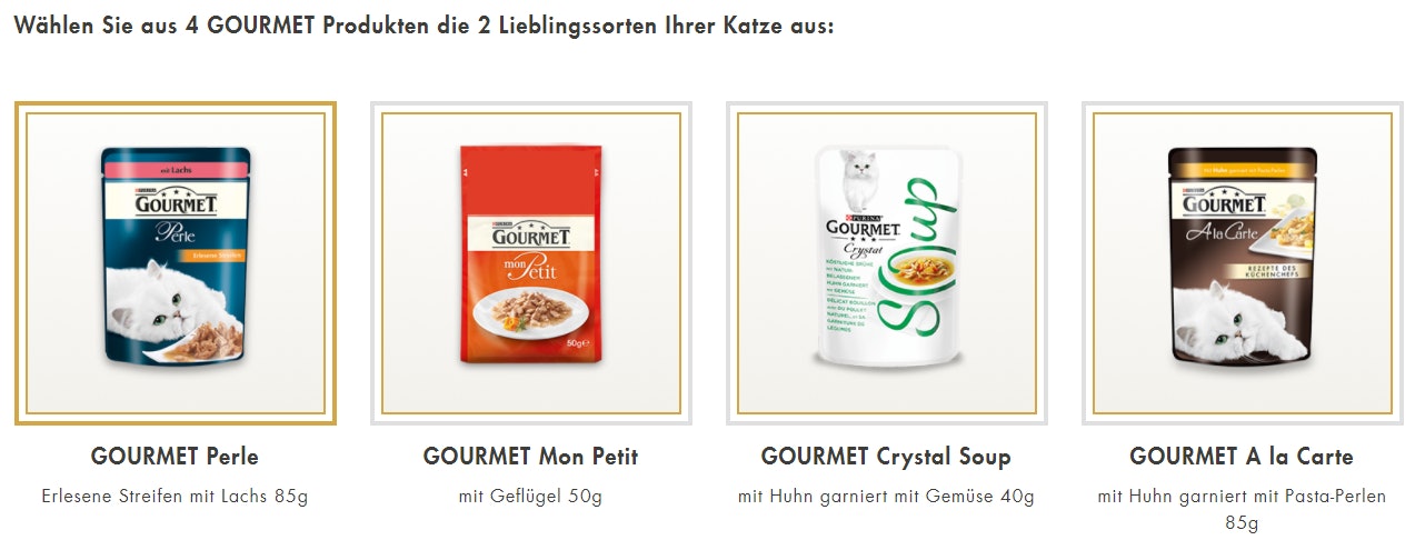 Bei Purina gibt es gerade ein Gewinnspiel, das sich in jedem Fall lohnt, denn jeder bzw. jede Katze ist ein Gewinner. Wählt 2 von 4 Sorten der möglichen Gourmet Portionsbeutel, gebt eure Adresse ein und lasst sich euch zusenden. Um an diesem "Gewinnspiel" teilzunehmen, müsst ihr den Empfang des Newsletters zustimmen. Falls euch die Nachrichten zu viel sein sollten, könnt ihr sie kurz danach abbestellen.
