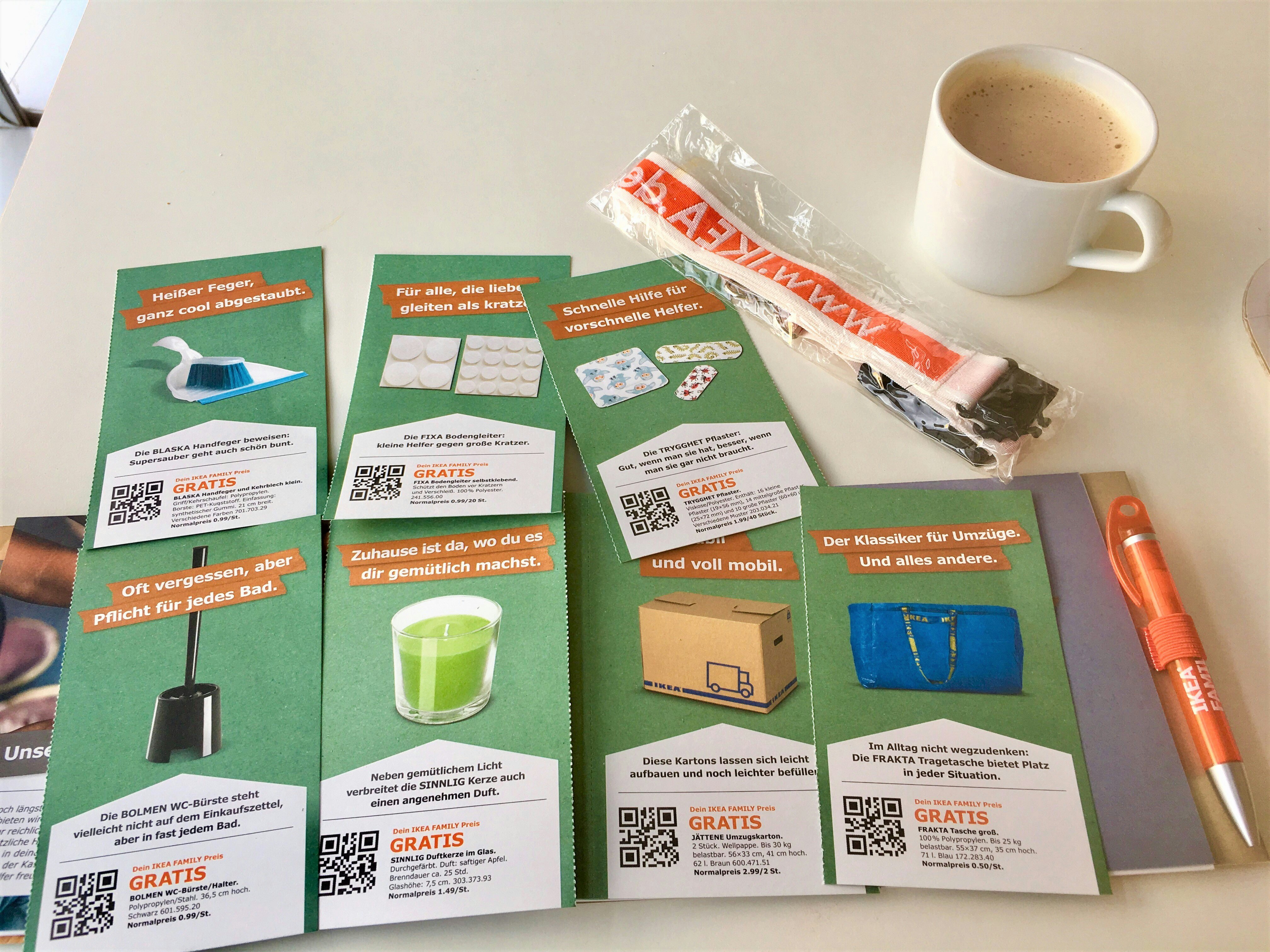 Immer noch könnt ihr euch zum Umzugsnewsletter anmelden und euch am Servicestand die Gutscheine für 7 Produkte abholen. Einziges Manko: ihr bekommt pro Einkaufsvorgang nur ein Produkt bzw. könnt nur einen Gutschein einlösen. Ich habe einfach an den Selbstbedienerkassen mehrere Male „eingekauft“. Gültig ist das Ganze für Ikea Family Mitglieder – und eine Kaffee gibt`s kostenlos on top. Außerdem erhaltet ihr ein Schlüsselband, einen Kugelschreiber und in einer weiteren E-Mail (nach ca. 2 – 3 Wochen) einen Hot Dog Gutschein. Den Deal dazu findet ihr hier.