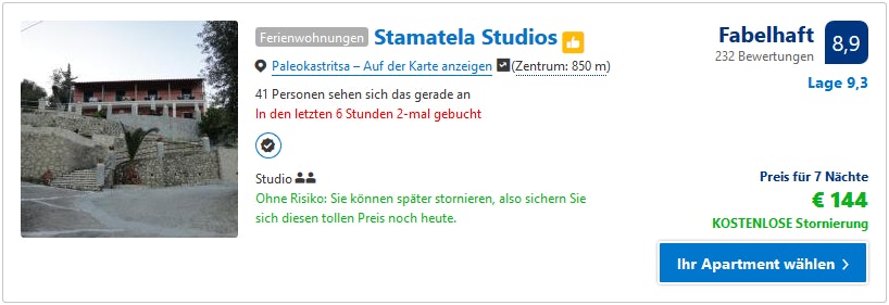 Die günstigste Unterkunft auf Korfu sind die Stamatela Studios, die ine ziemlich gute Bewertung mit 8,9 von 10 Punkten bei Booking einheimsen. Bei Tripadvisor sehen die Bewertungen ähnlich aus – man kann sich also auf einen entspannten Urlaub freuen. Ansonsten könnt ihr auch gerne bei Airbnb nach günstigen Unterkünften bei Privatpersonen suchen.