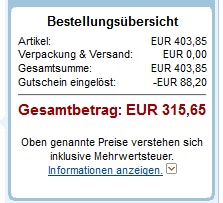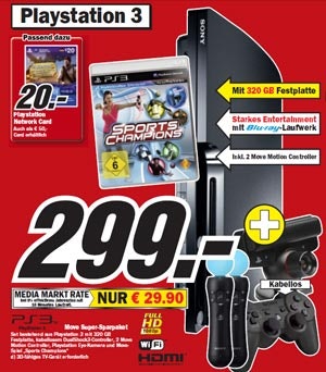 - Sony PS3 320GB + Move Starter Pack + Move Motion Controller + Sports Champions + L.A. Noire für 315,65 (Preisvergleich: 264 + 28 + 34 + 37 = 363) – einfach alles in den Warenkorb legen, Rabatt wird im letzten Bestellschritt abgezogen