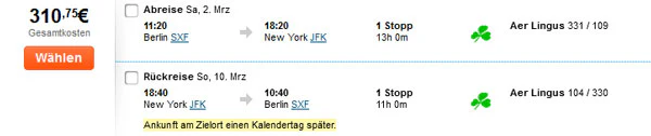 Wie immer solltet ihr nicht zu lange überlegen und schnell sein mit der Buchung. Der Flug hat einen Stop in Dublin, sollte aber zu verkraften sein. Hier ein Beispiel, wie es dann aussieht: