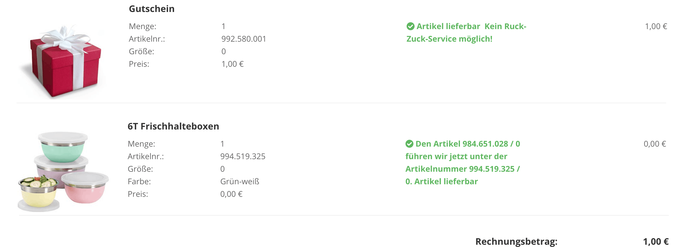 Schreiben Kommentar schreibenWeil ich nach Wochen die Bestellung immer noch nicht erhalten habe, habe ich einen Mail geschrieben, wo die Bestellung bleibt. Darauf habe ich folgende Antwort bekommen: Sehr geehrter Herr XXX, vielen Dank für Ihre E-Mail. Leider hatte sich im WITT WEIDEN Online-Shop ein systemseitiger Fehler eingeschlichen, der eine Bestellung des Geschenkes auch ohne Erreichen des verbindlichen Mindestbestellwertes in Höhe von 25 € kurzzeitig ermöglichte. Bitte entschuldigen Sie das Versehen. Da es sich bei diesem Mindestbestellwertes um eine zwingende Vorraussetzung für den Erhalt des Geschenkes handelt, wurde Ihre Bestellung nach unserer manuellen Prüfung und Feststellung des nicht-eingehaltenen Mindestbestellwertes storniert. Vielen Dank für Ihr Verständnis.