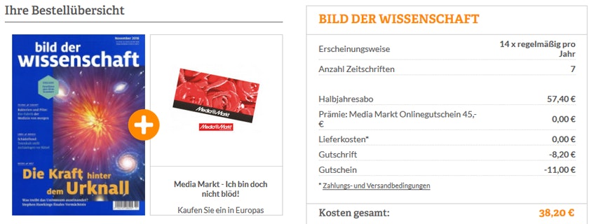 - Halbjahresabo Bild der Wissenschaft für 38,20€ bei abo-direkt.de (sonst: ~57€)