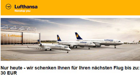 Schreiben Kommentar schreibenfür europaflüge 'n schönes angebot. haken besteht darin, dass einige lufthansastrecken nun von german wings bedient werden, z.b. nach helsinki. da funzt der gutschein leider nicht. bei der letzten aktion war das noch anders und ein echtes schnäppchen.
