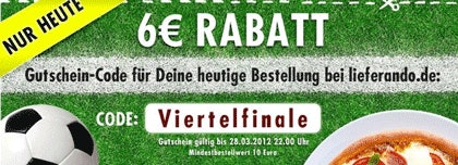 Update 1: Heute nochmal das gleiche Angebot zur Europa League! 6€ lieferando Gutschein: Europapokal für Neu- und Bestandskunden Mindestbestellwert: 10€ gültig: nur heute am 29.03.12 von 17-22 Uhr