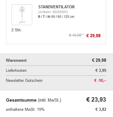 Schreiben Kommentar schreibenPreis würde angehoben gestern erst fur14.99 Euro dann offline heute je 19.99 aber die haben noch einen anderen Ventilator auf der Seite der ähnlich aussieht aber etwas stabiler ist der hat gestern auch schon 19.99 gekostet plus ein Eierlöffel für 90 Cent( füllartikel) minus 10 euro Newsletterbonus(ab 20€) plus Versand sind irgendwas knapp über 14 euro