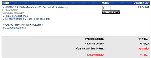 - HP Envy 14-1101eg für 749,01 inkl. Versand mit Gutscheincode HPDE300STEN (Preisvergleich: 999) – XE655EA in die Suche eingeben, Direktlink geht nicht