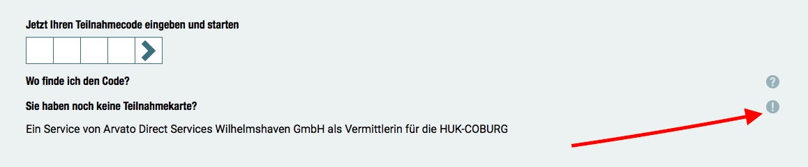 Für die Teilnahme benötigt ihr den Teilnahmecode 7g7c aufgedruckt. Diesen findet ihr auf Flyern, die die HUK verteilt oder auf Karten von kooperierenden Finanzberatern.
