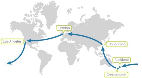 - Route: London Heathrow » Los Angeles » Auckland (per Eigenreise nach) Christchurch » Hong Kong » London Heathrow