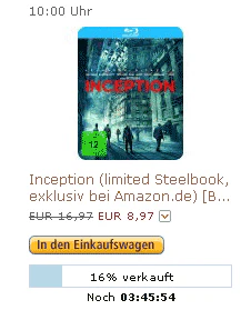 Den Preis bekommt man nur über die Amazon Blitzangebote Seite und er gilt nur, solange der Vorrat reicht. Das Beste, was es bisher gab, waren 10 bei Conrad (normale Blu-Ray) für den spektakulären Streifen von Regisseur Christopher Nolan (IMDB 8,9/10).